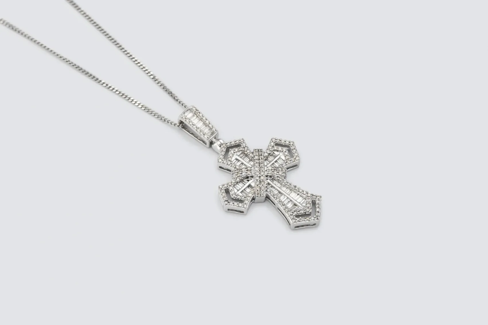 Refined and radiant, this 9ct white gold diamond cross pendant necklace embodies timeless style and exceptional craftsmanship. Adorned with 1.25 carats of natural brilliant and baguette-cut diamonds, each stone is prong set to capture and reflect light with dazzling precision.