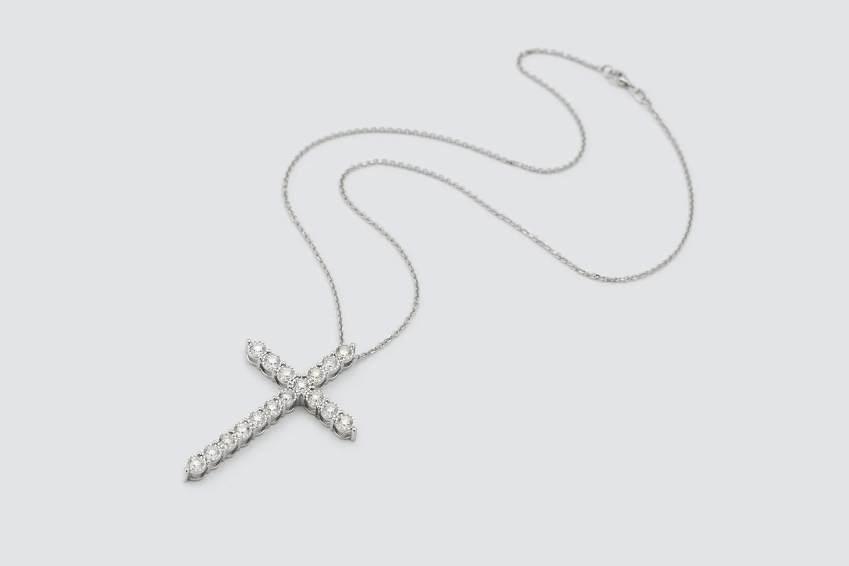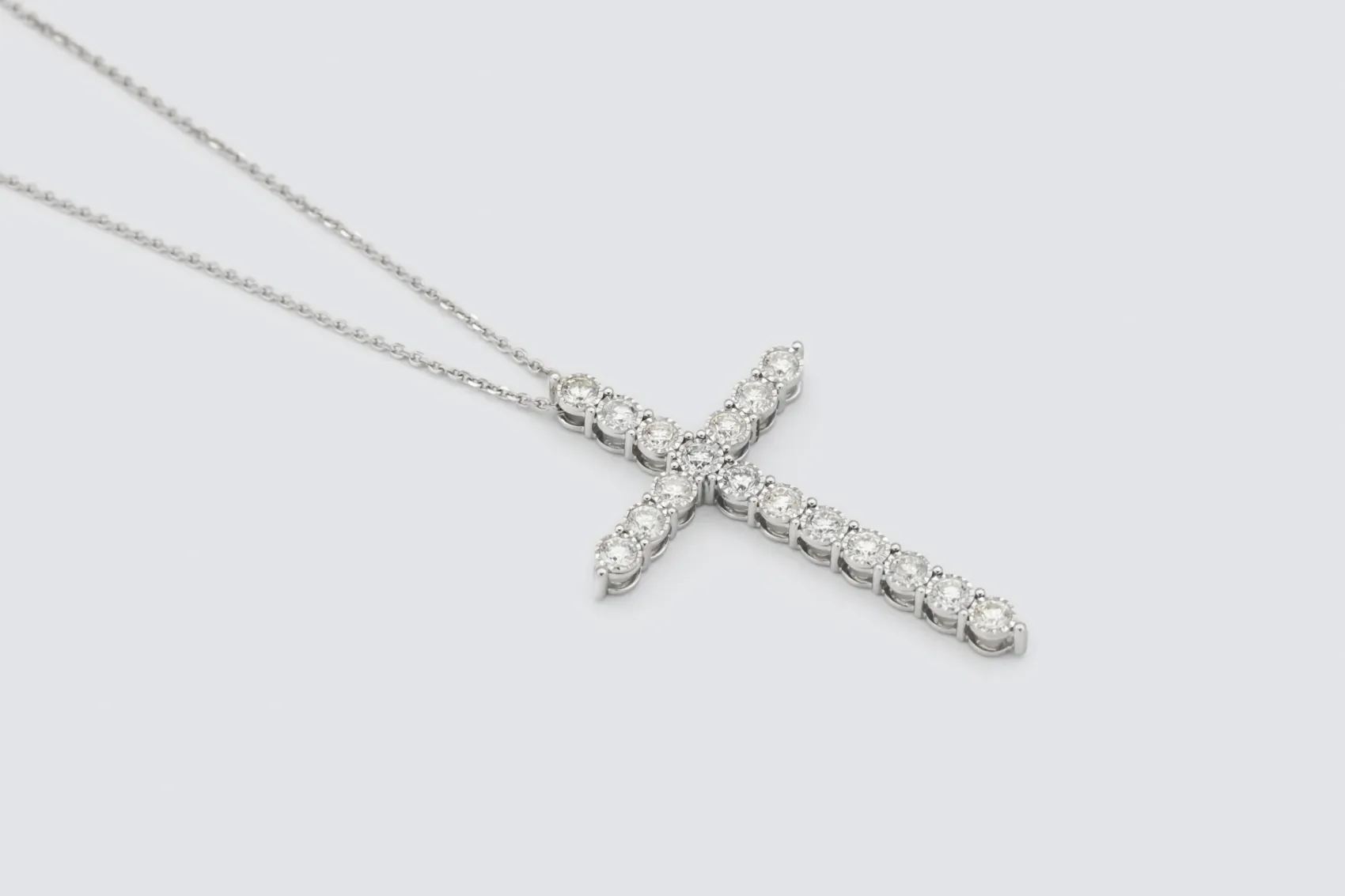Radiant and commanding, this 9ct white gold diamond cross pendant necklace showcases the perfect balance of luxury and craftsmanship. Set with 3.09 carats of natural brilliant-cut diamonds in a refined illusion setting, each stone has been carefully positioned to create a seamless surface of dazzling brilliance.