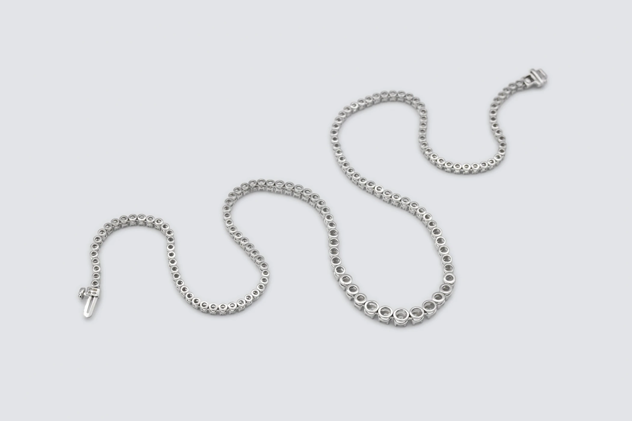 Graceful and captivating, this 9ct white gold diamond tennis necklace features 4.00 carats of graduated brilliant-cut natural diamonds, each expertly claw set to maximise sparkle and brilliance. The subtle graduation of diamond sizes creates a fluid, balanced design that drapes beautifully along the neckline, radiating refined sophistication.