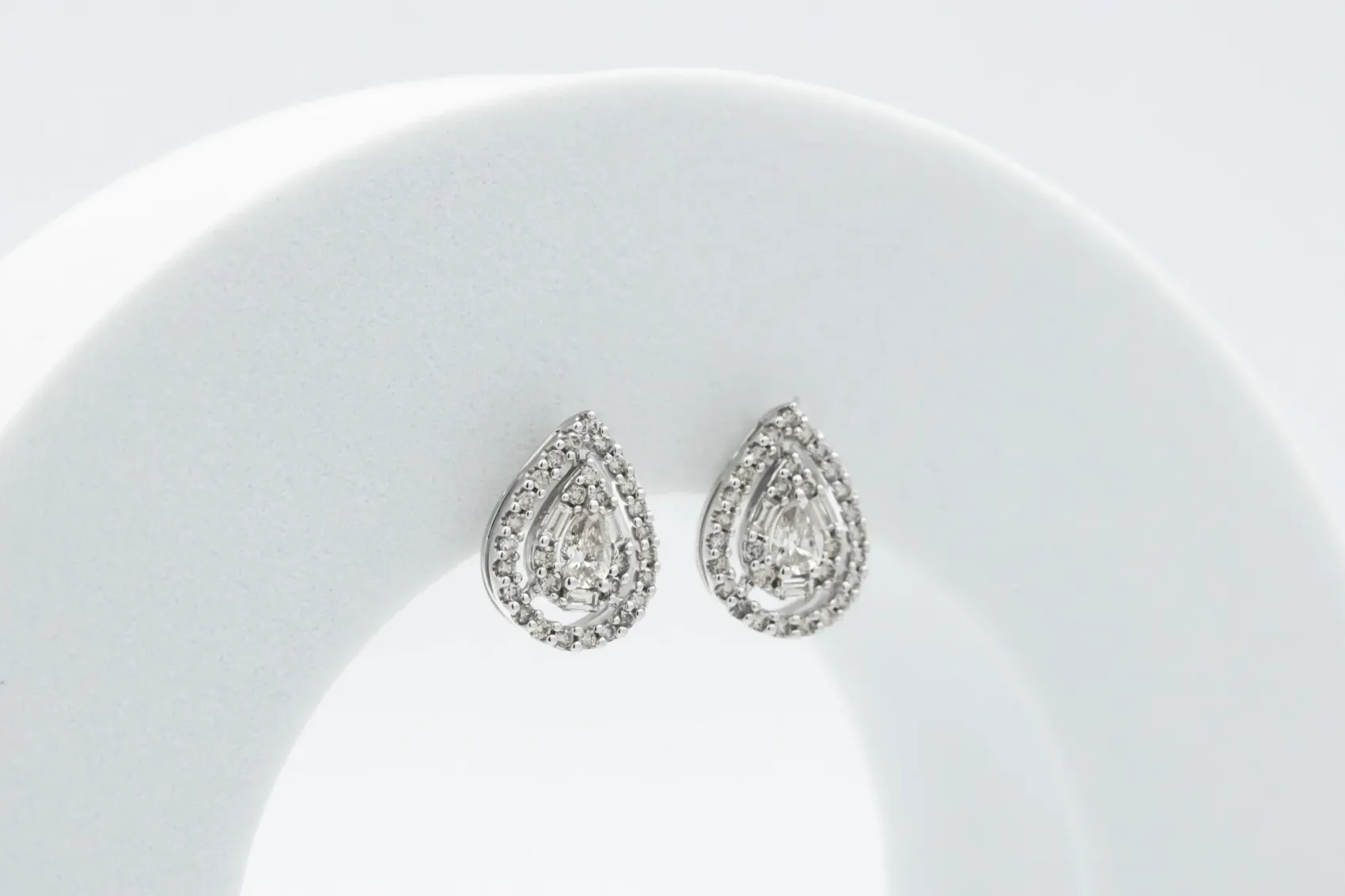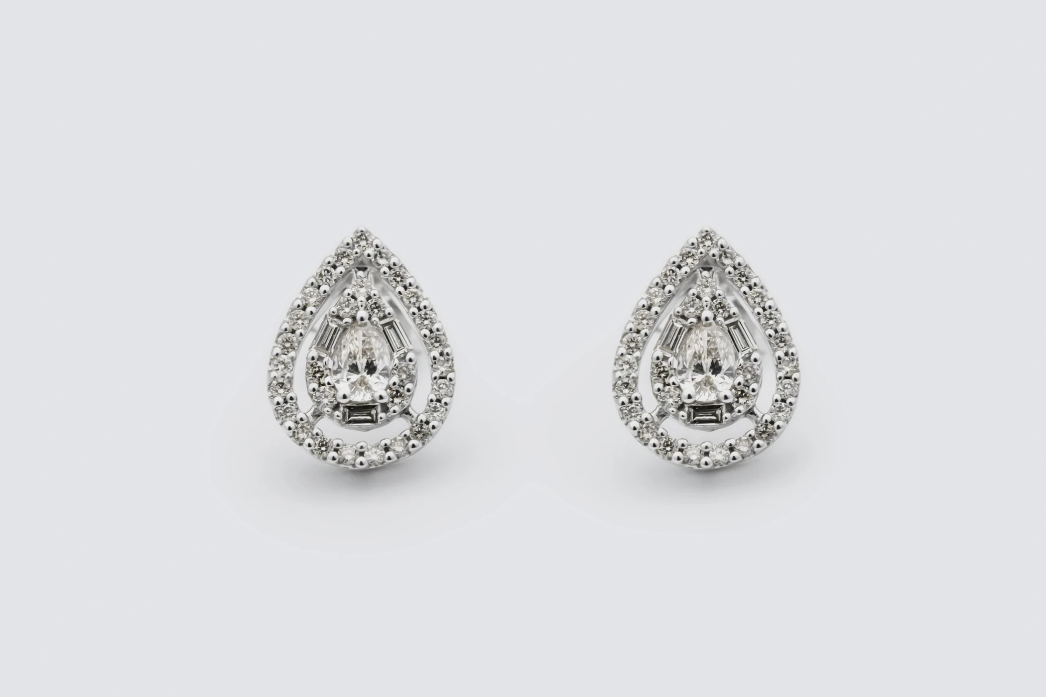 Elegant and refined, these 9ct white gold pear-shaped diamond stud earrings beautifully combine timeless sophistication with radiant brilliance. Set with a total of 1.00 carat of natural brilliant and baguette-cut diamonds, each earring is meticulously prong set to enhance sparkle and light reflection.