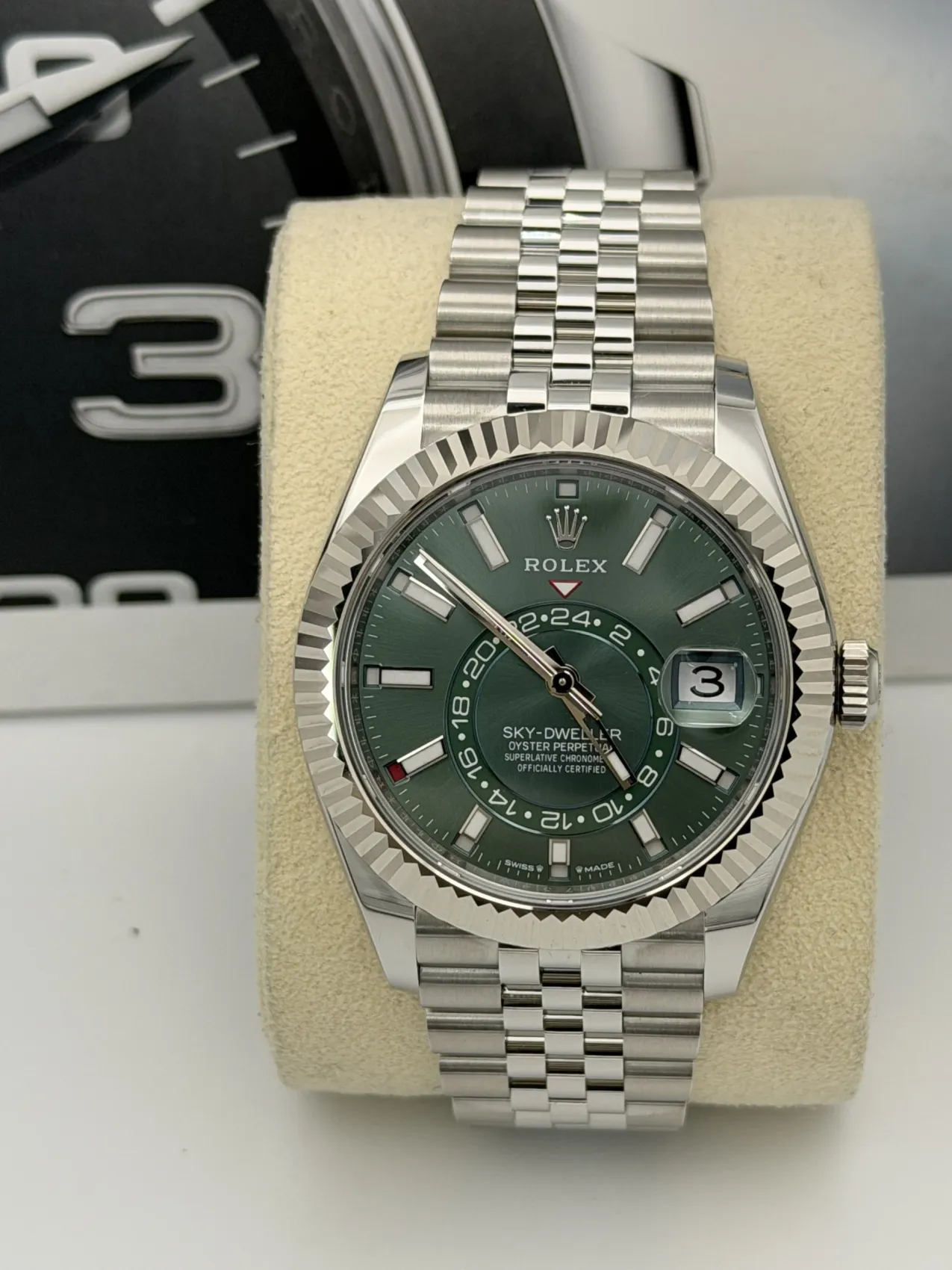 This Rolex Sky-Dweller 336934 features a striking mint green dial, a white gold fluted bezel, and the elegant Jubilee bracelet. Powered by Rolex’s advanced annual calendar and dual-time automatic movement, this 42mm Sky-Dweller offers exceptional functionality and modern luxury, presented in excellent condition.