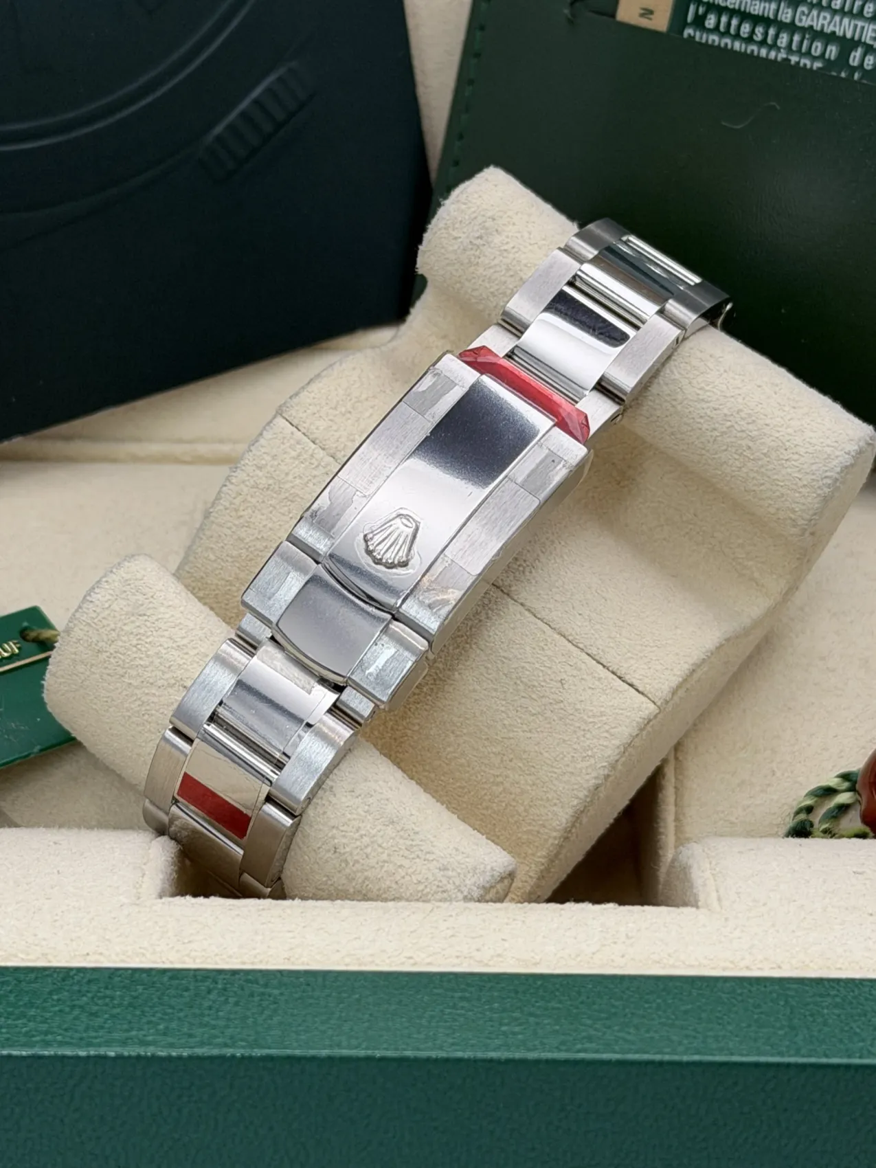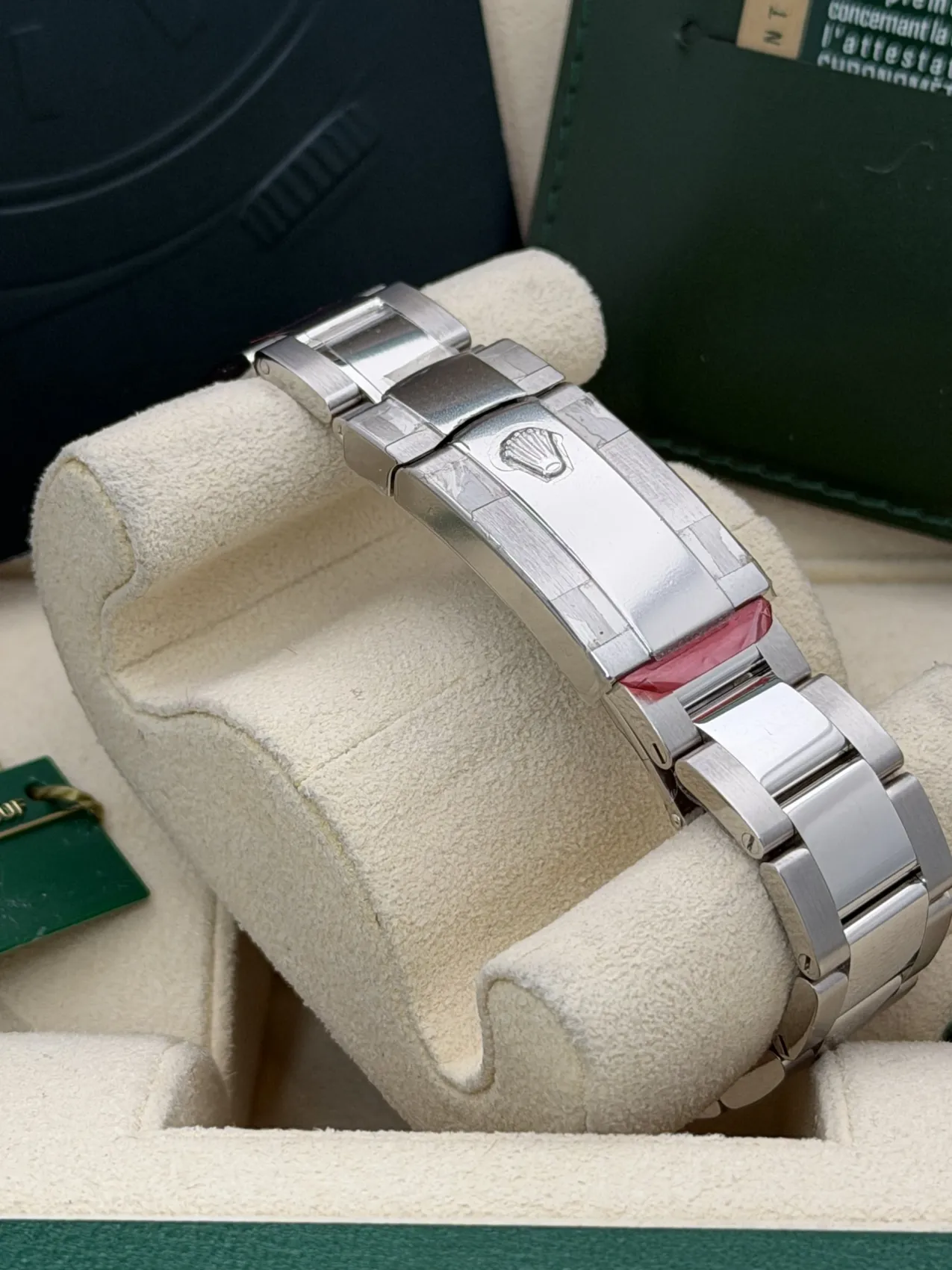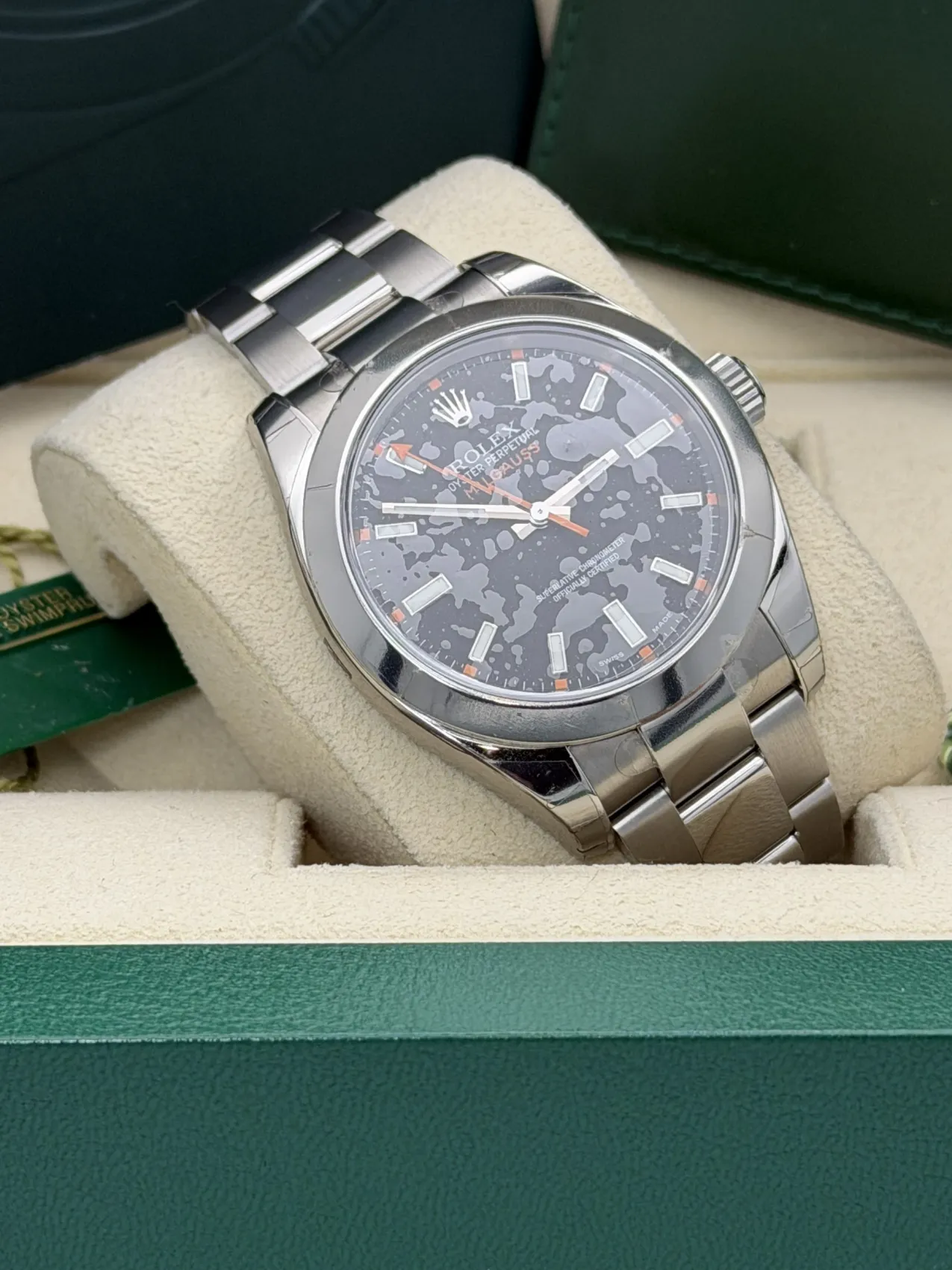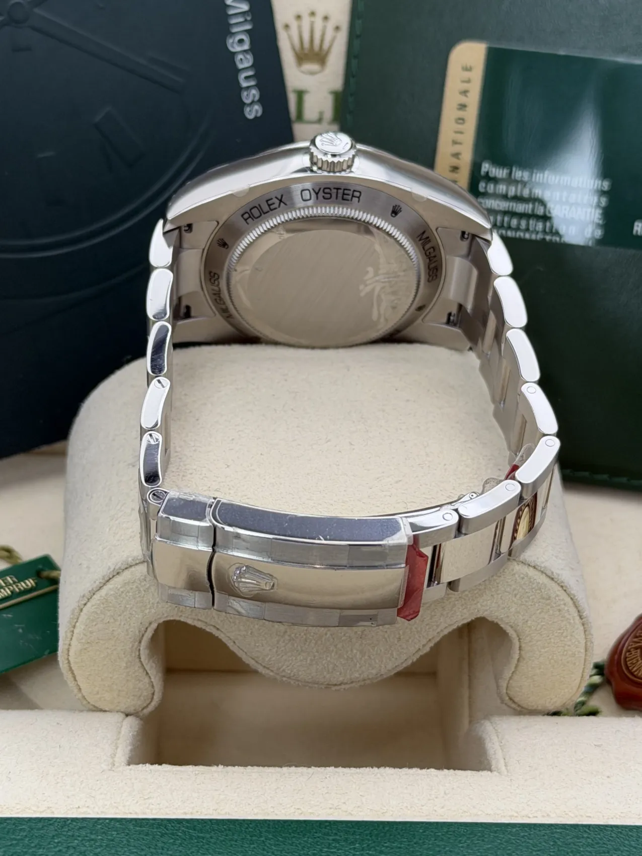 This Rolex Milgauss 116400 features a stainless steel case, smooth bezel, black dial with the signature lightning-bolt seconds hand, and the classic Oyster bracelet. Designed for exceptional magnetic resistance and powered by Rolex’s automatic movement, this 40mm Milgauss is presented in excellent condition and remains one of the most distinctive models in the Rolex Professional range.
