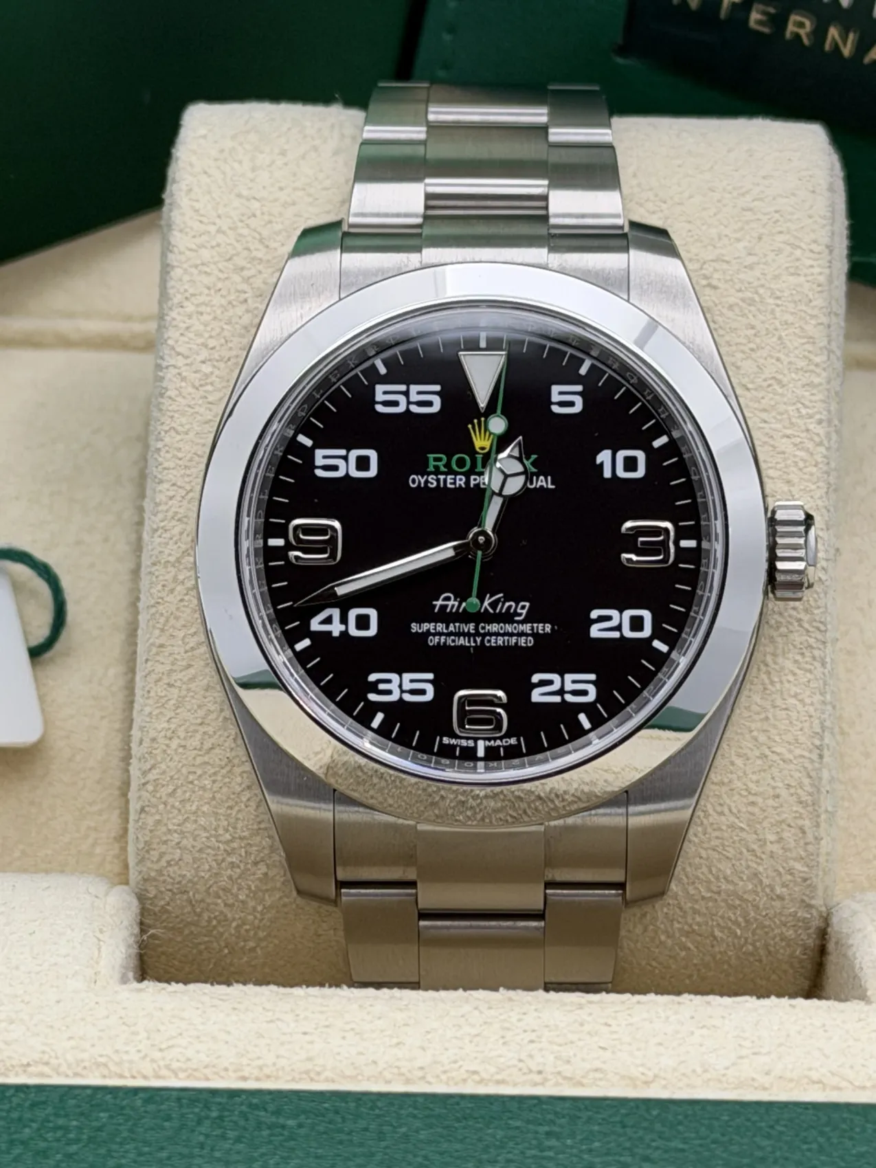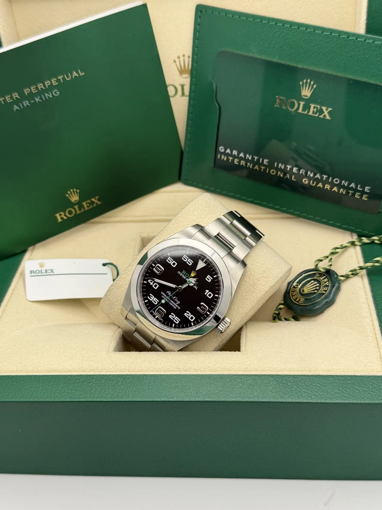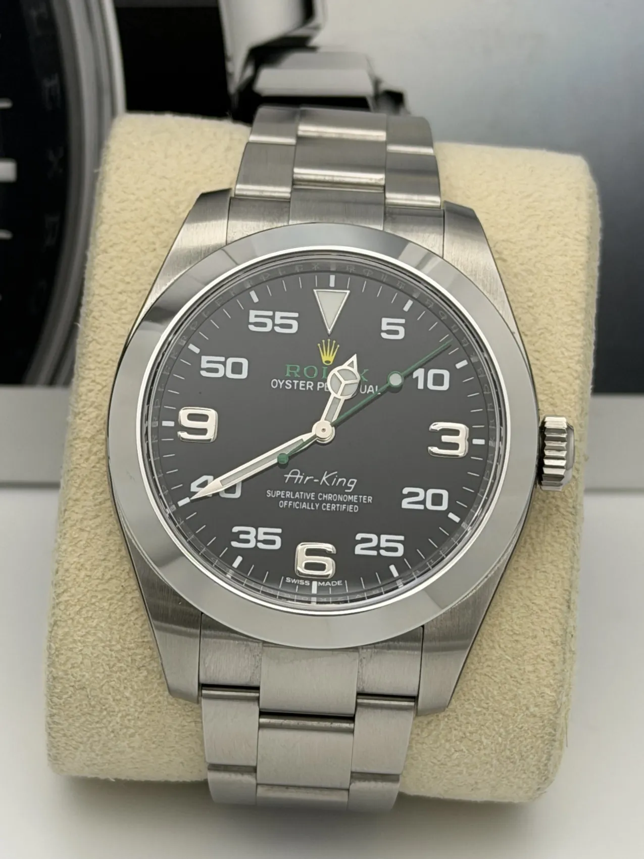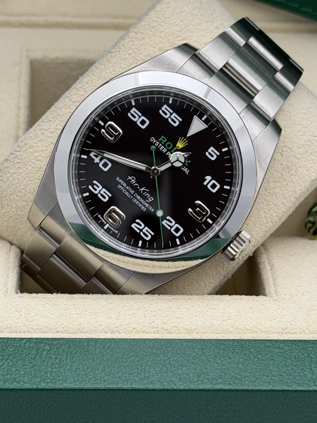 This Rolex Air-King 40 features a stainless steel case with a smooth bezel, a black dial with signature Arabic numerals, and the classic Oyster bracelet, powered by Rolex’s automatic movement, offered in excellent condition.