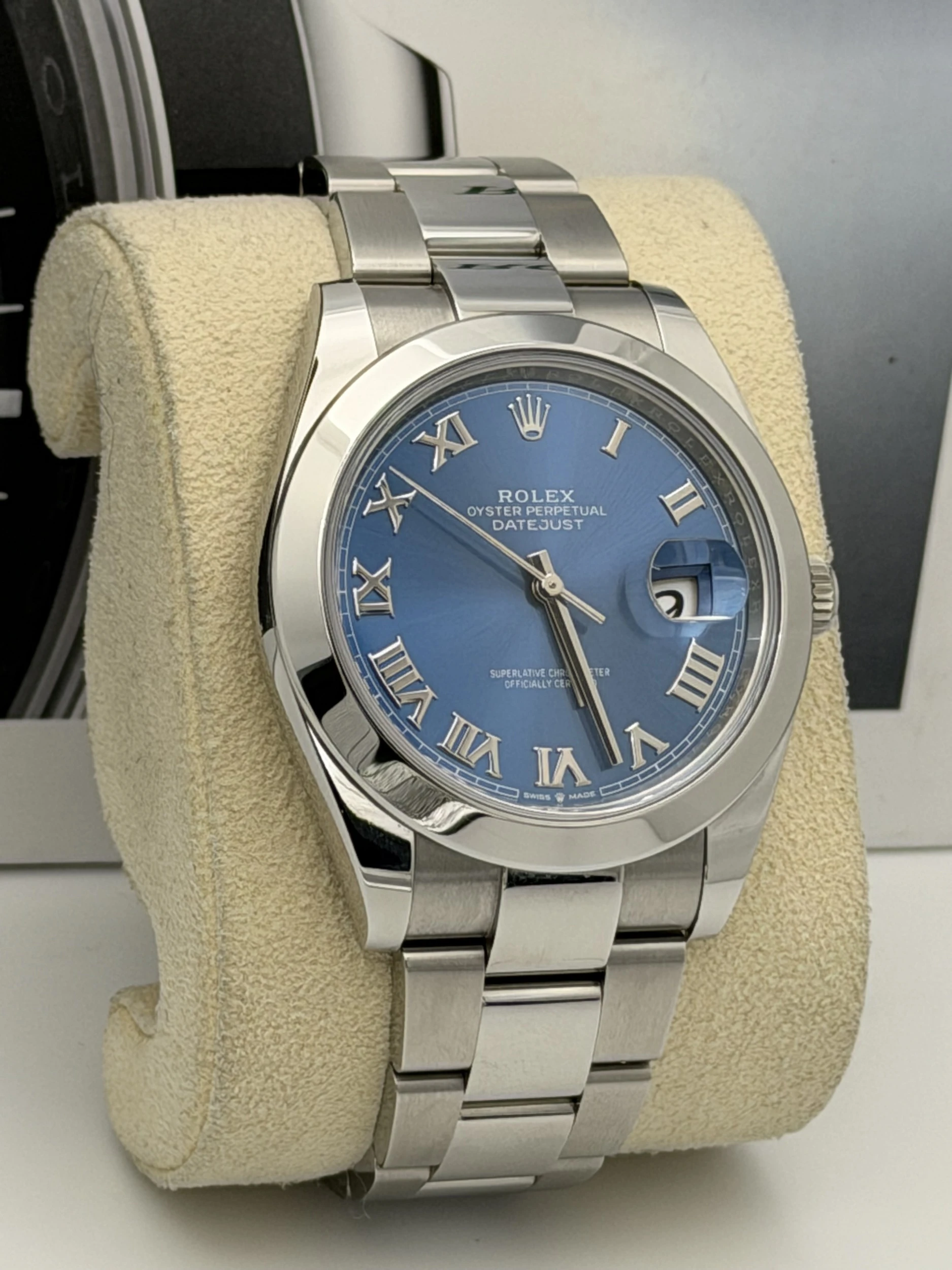 This Rolex Datejust 41 reference 126300 features a vibrant Azzurro blue dial, smooth stainless steel bezel, and the classic Oyster bracelet. Powered by Rolex’s automatic movement and presented in excellent condition, this 2023 model offers a modern and versatile take on the iconic Datejust design.