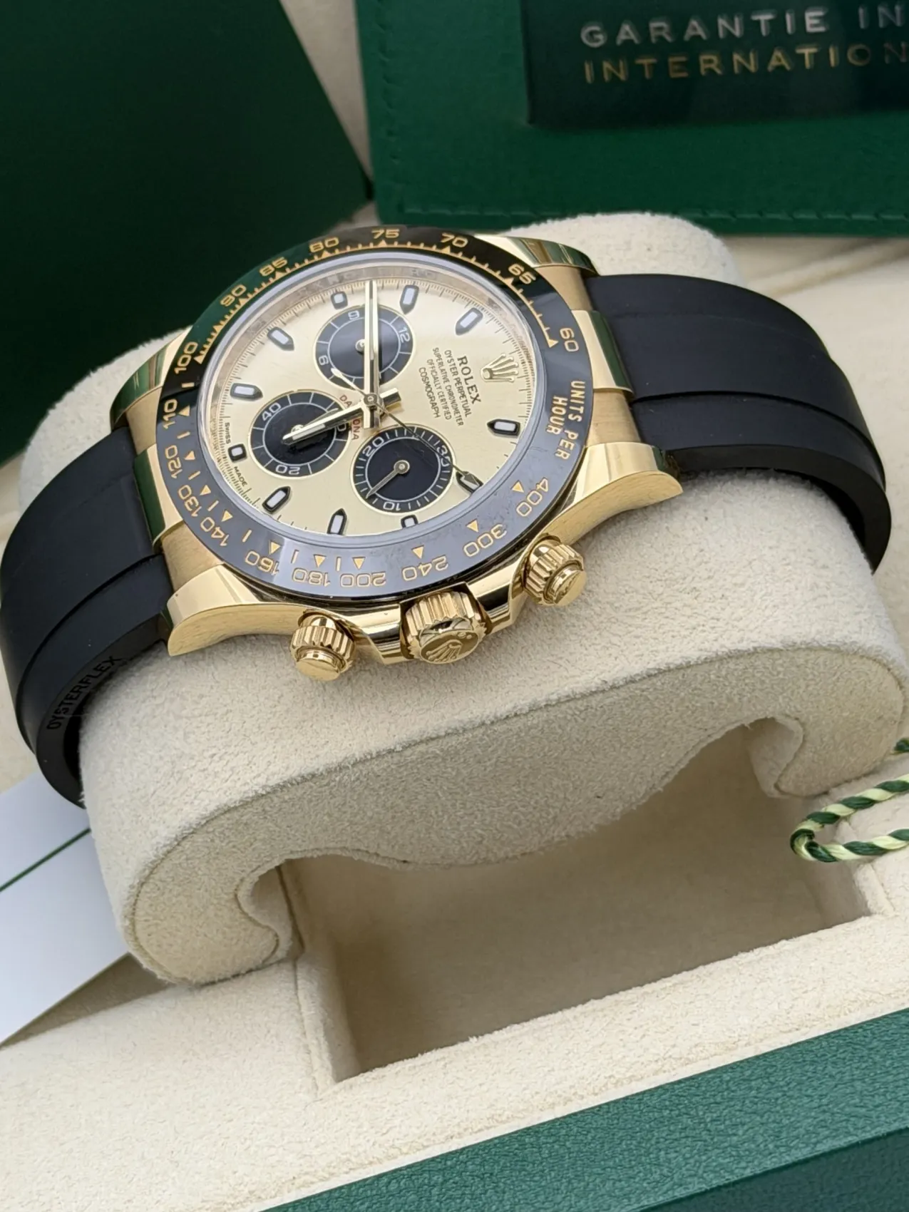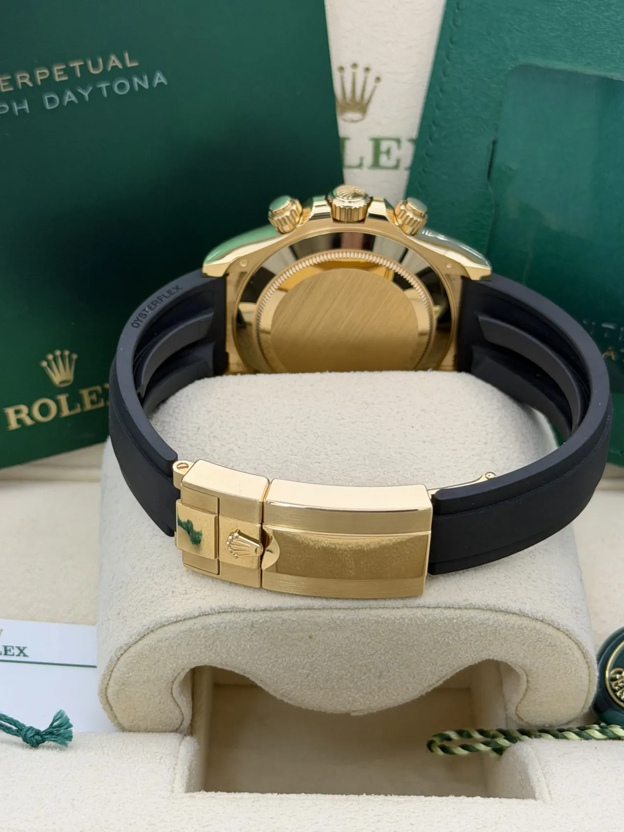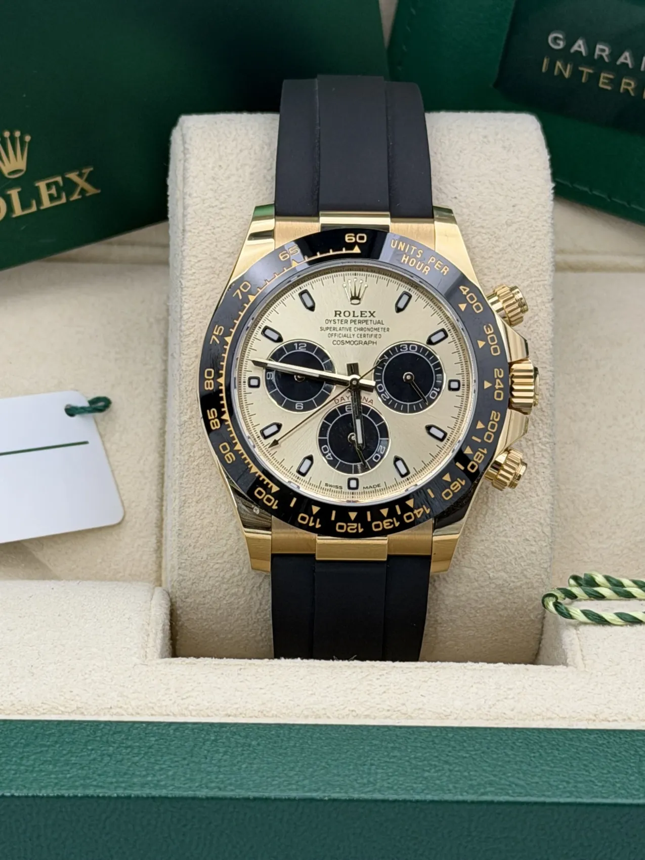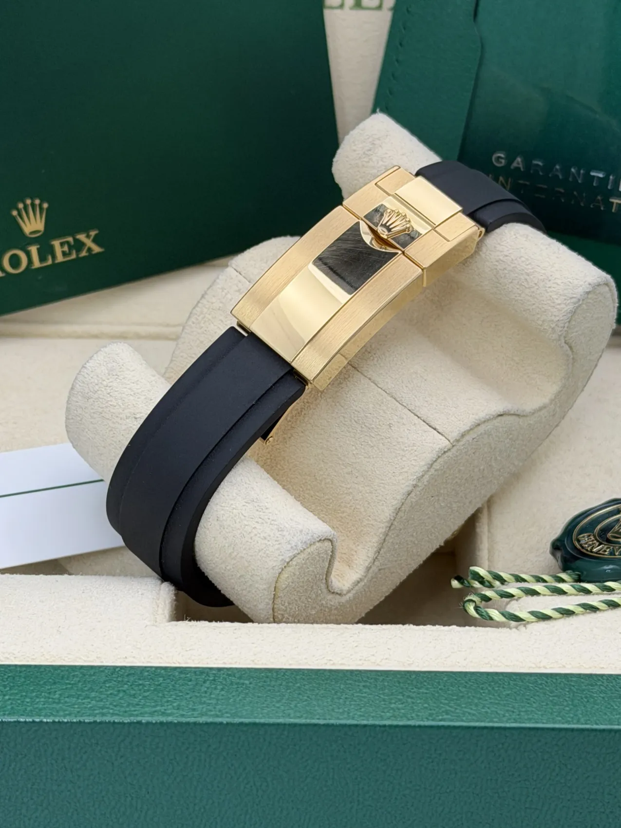 This Rolex Daytona 116518LN—nicknamed the “Pikachu” due to its striking yellow gold case paired with black Oysterflex strap—features a black ceramic bezel, black dial, and Rolex’s legendary chronograph automatic movement. This sought-after 40mm yellow gold sports model is presented in excellent condition and remains one of the most desirable modern Daytona configurations.