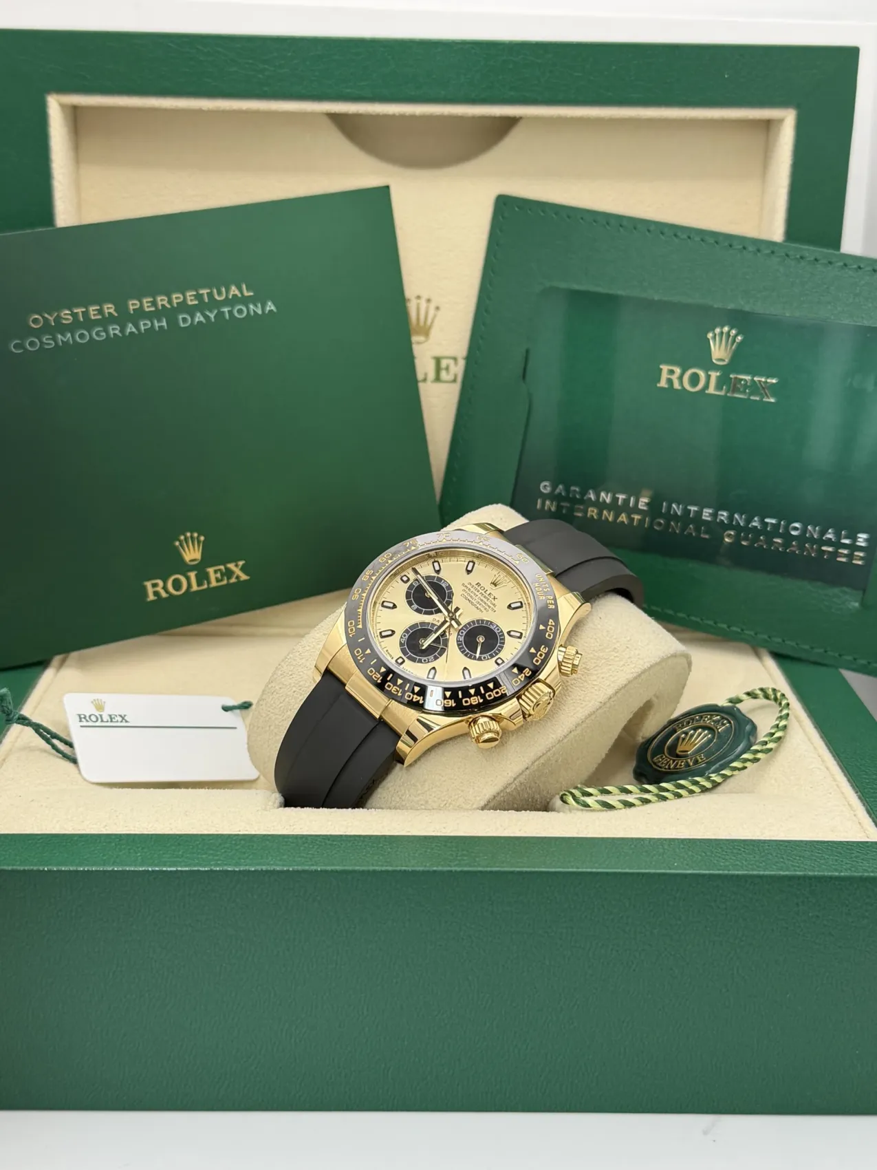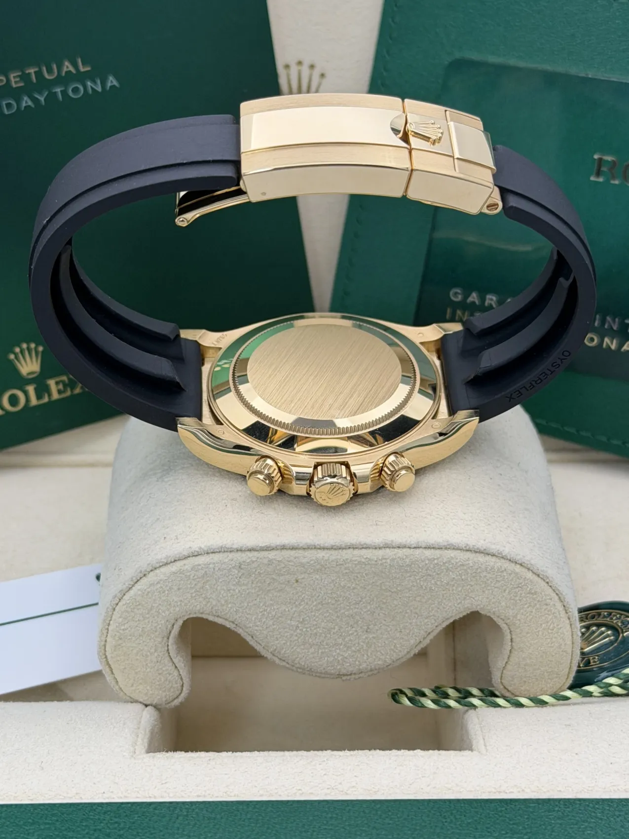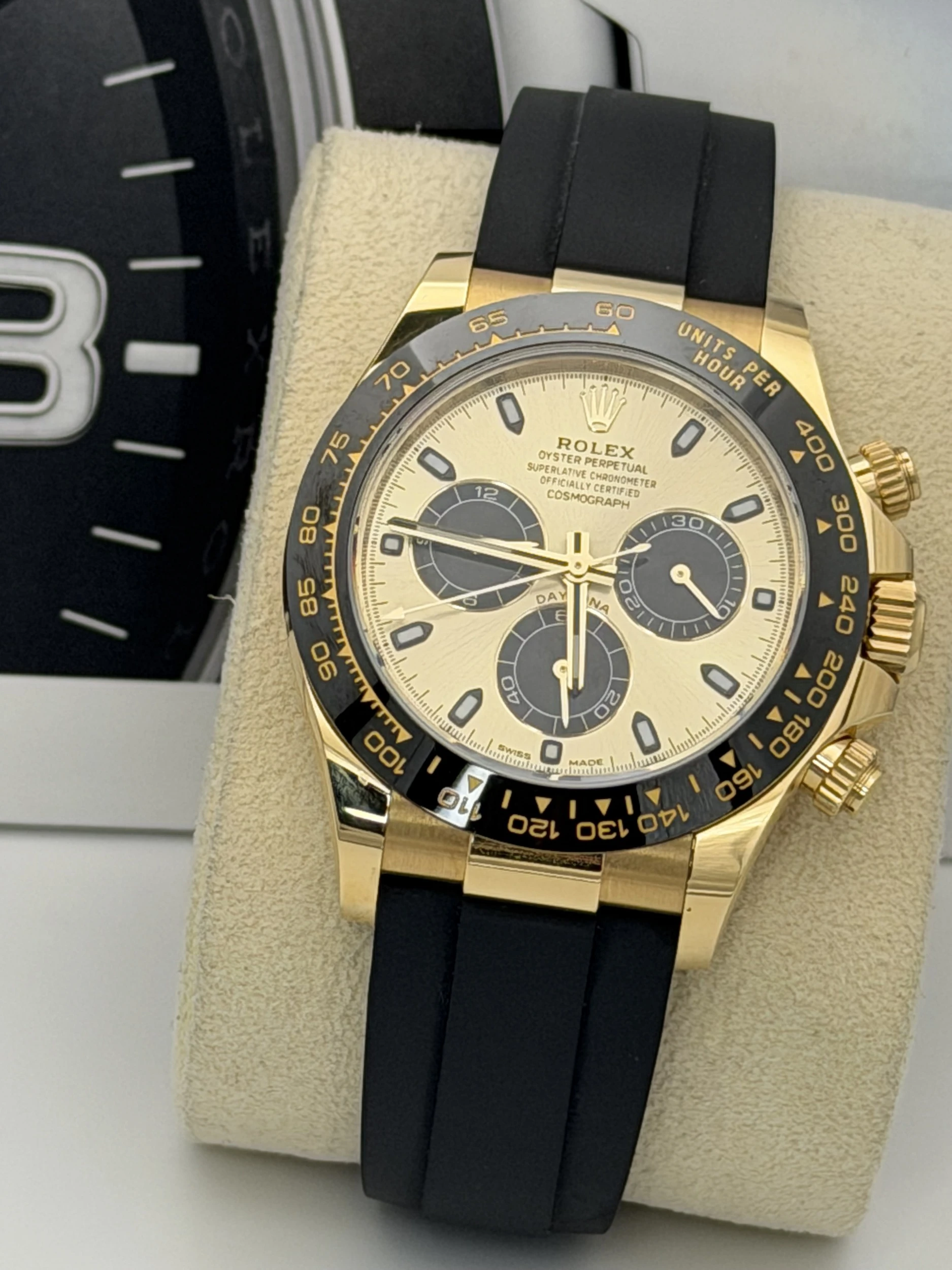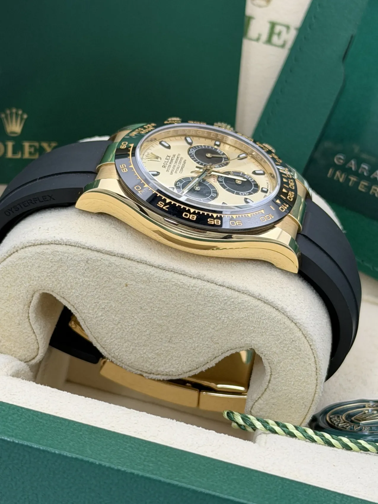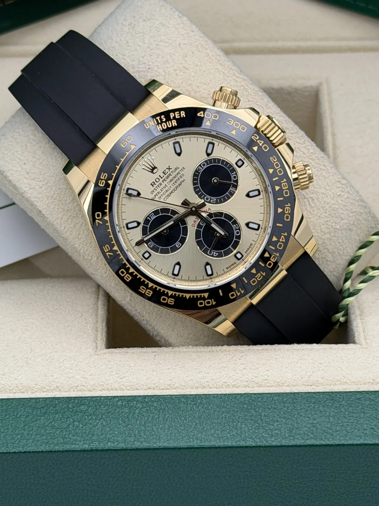 This Rolex Daytona 116518LN—nicknamed the “Pikachu” due to its striking yellow gold case paired with black Oysterflex strap—features a black ceramic bezel, black dial, and Rolex’s legendary chronograph automatic movement. This sought-after 40mm yellow gold sports model is presented in excellent condition and remains one of the most desirable modern Daytona configurations.