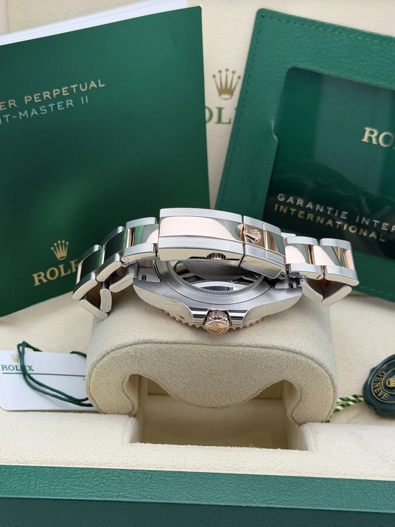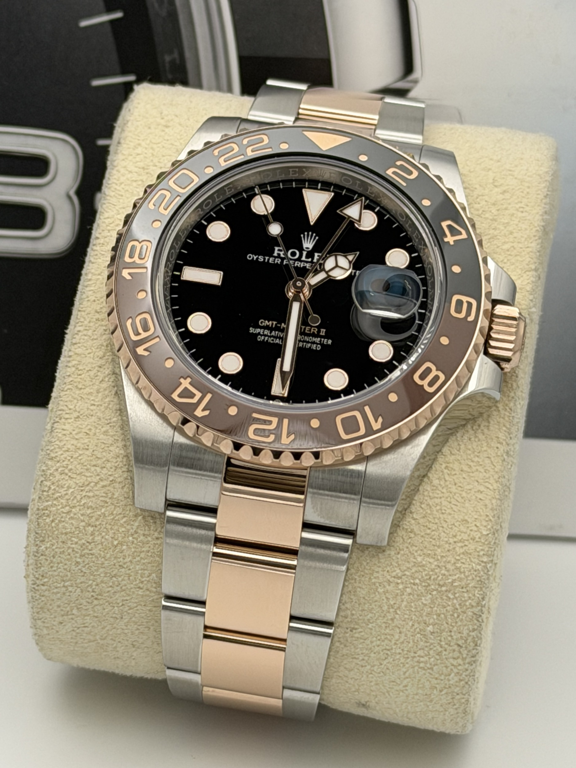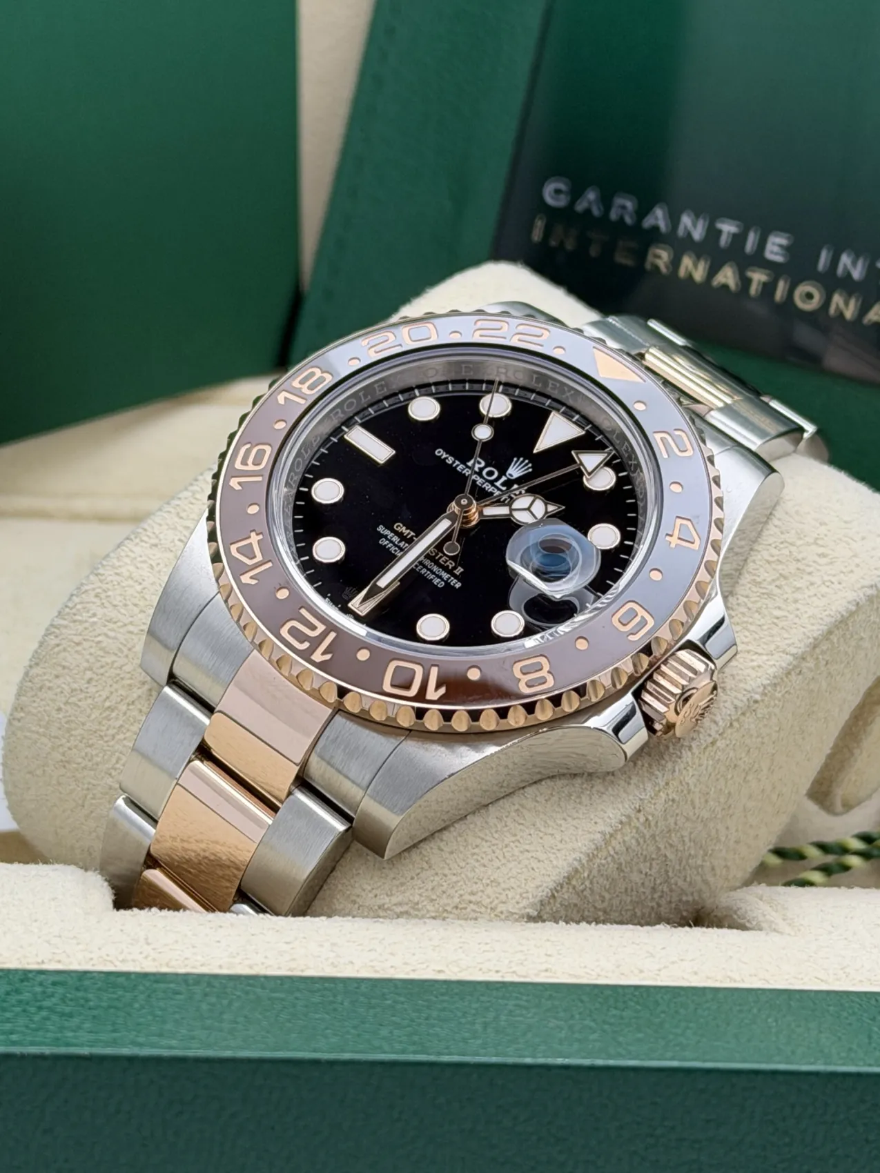 This Rolex GMT-Master II 40mm reference 126711CHNR features a stainless steel and 18ct Everose gold case, black dial, brown and black Cerachrom “Rootbeer” bezel, Oyster bracelet, and automatic GMT movement, presented in excellent 2024 condition.