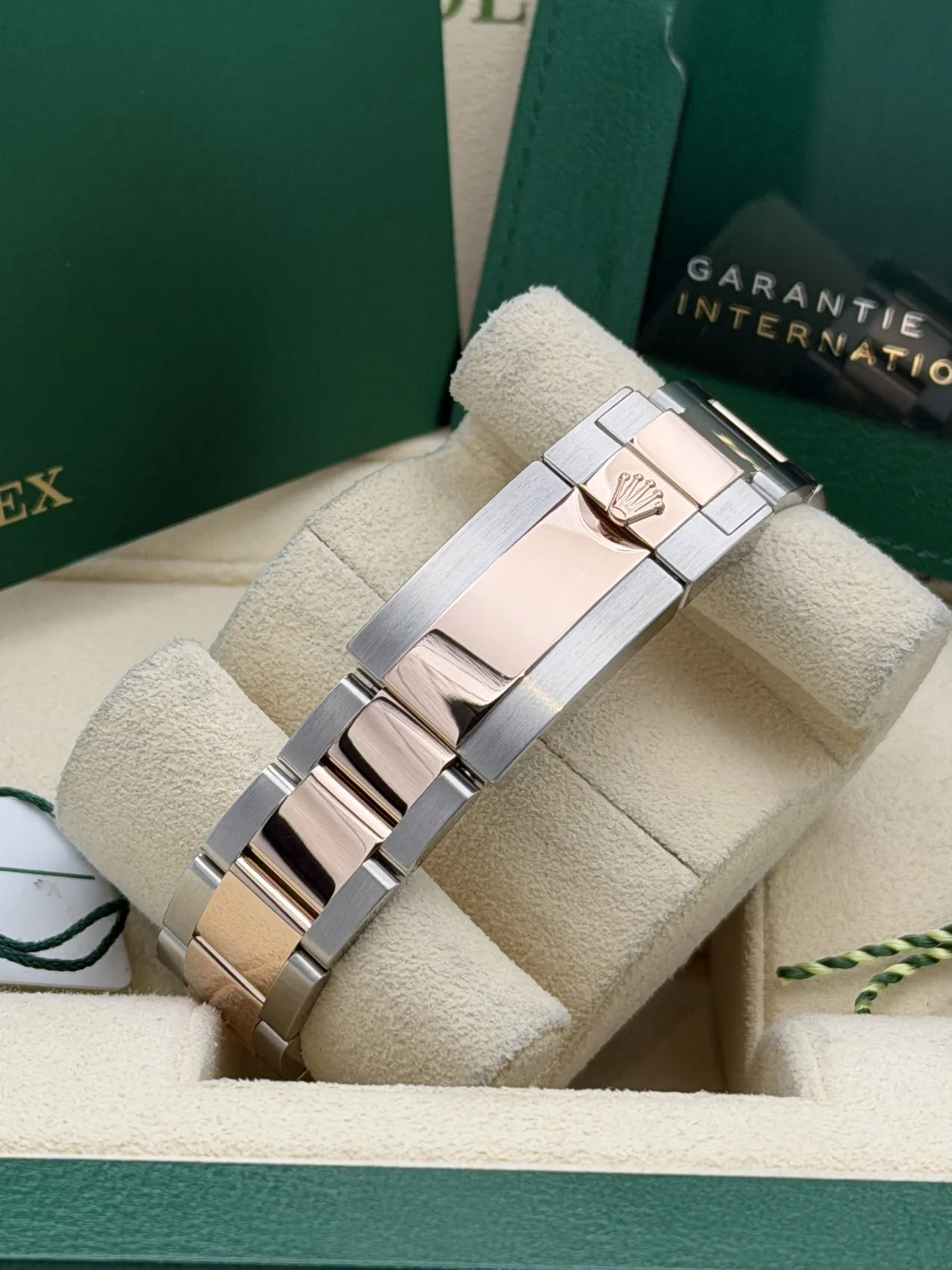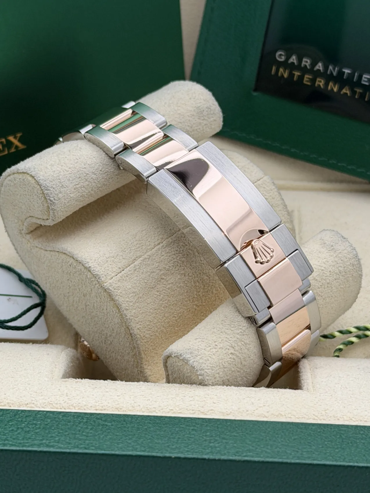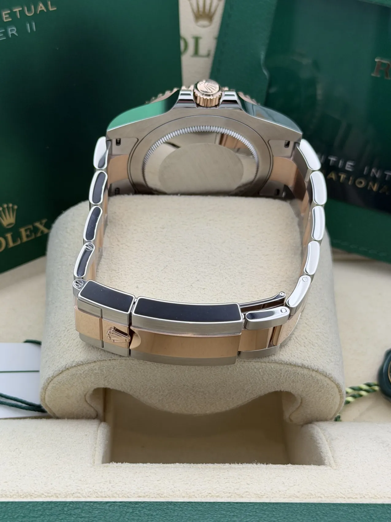 This Rolex GMT-Master II 40mm reference 126711CHNR features a stainless steel and 18ct Everose gold case, black dial, brown and black Cerachrom “Rootbeer” bezel, Oyster bracelet, and automatic GMT movement, presented in excellent 2024 condition.