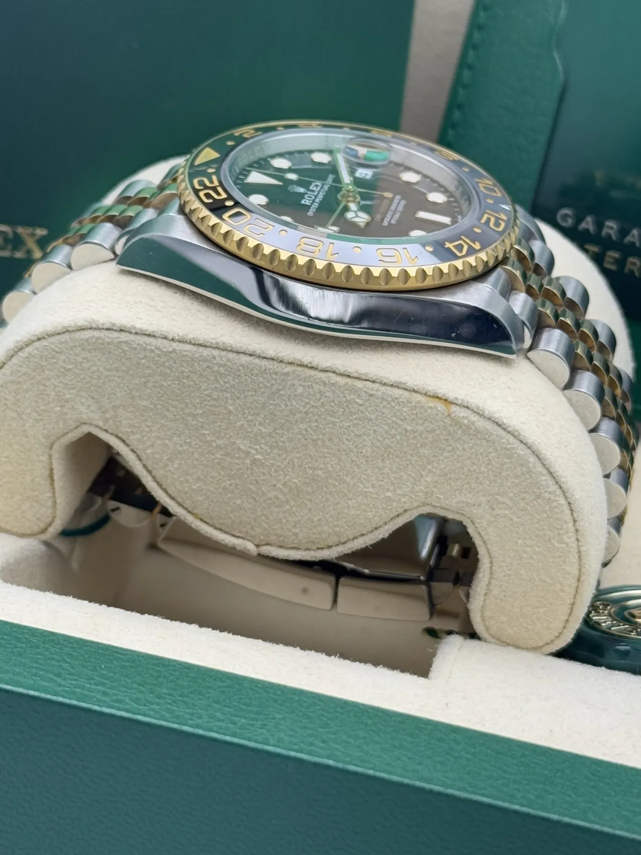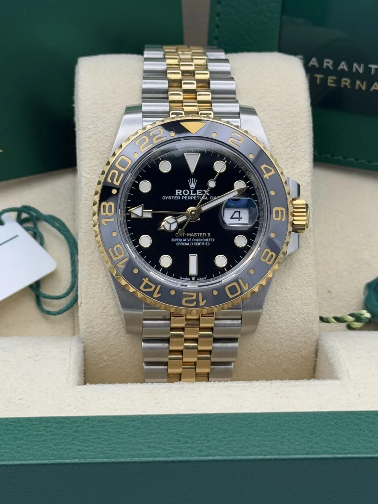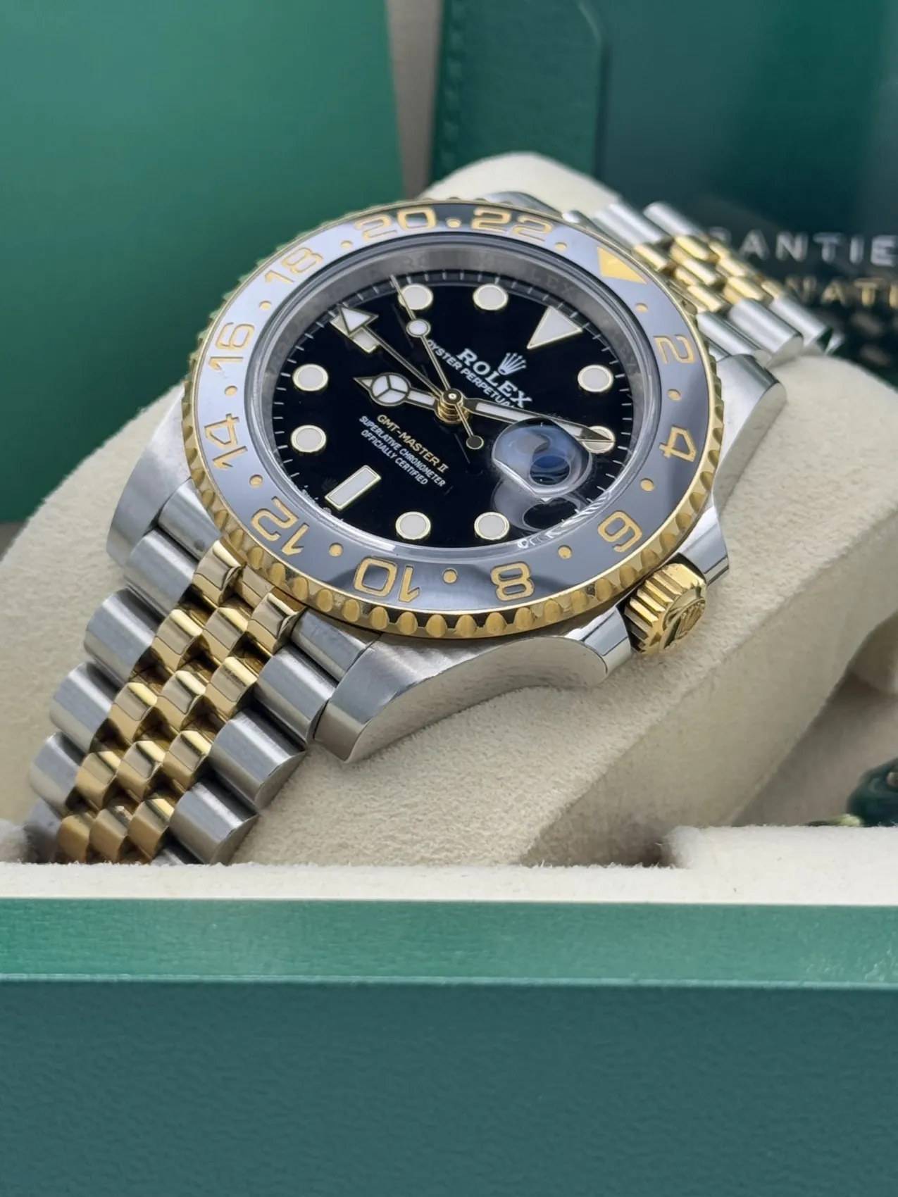 This Rolex GMT-Master II 40mm reference 126713GRNR features a stainless steel case, black dial, bi-colour grey and black Cerachrom bezel known as the “Zombie”, yellow gold and stainless steel jubilee bracelet, and automatic GMT movement, presented in excellent 2023 condition.