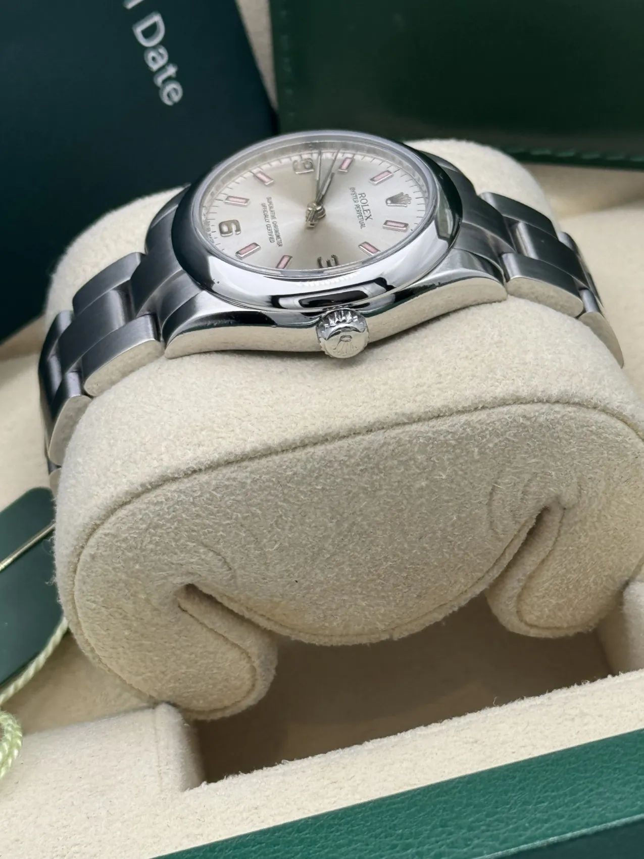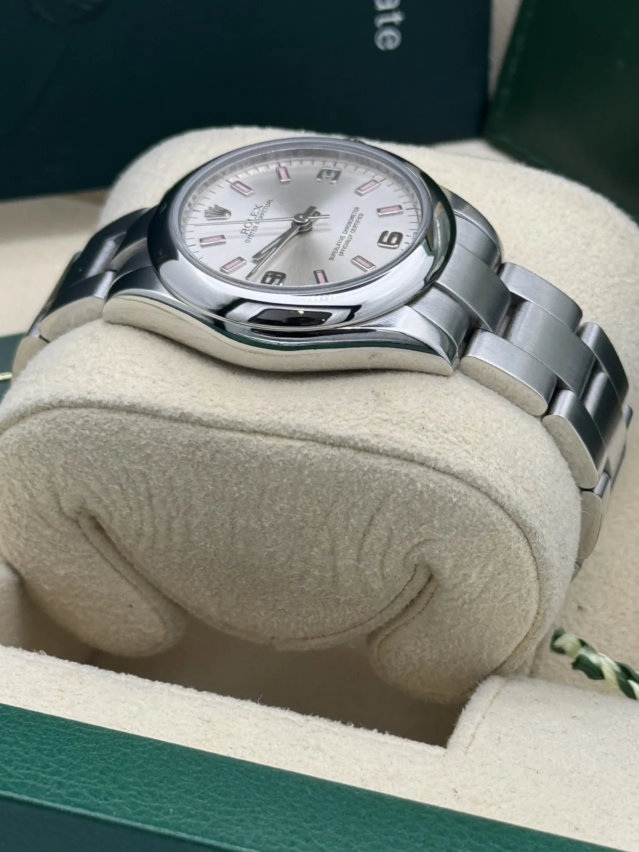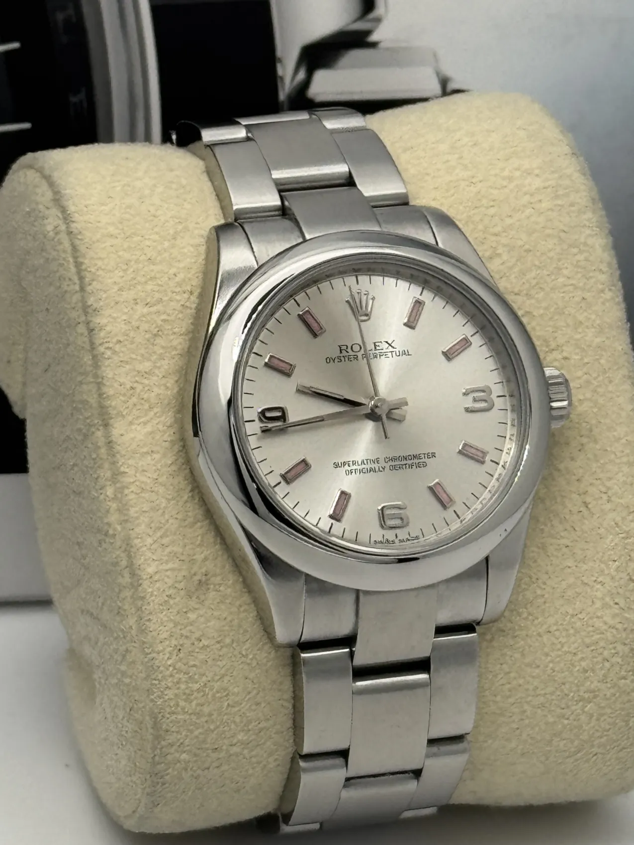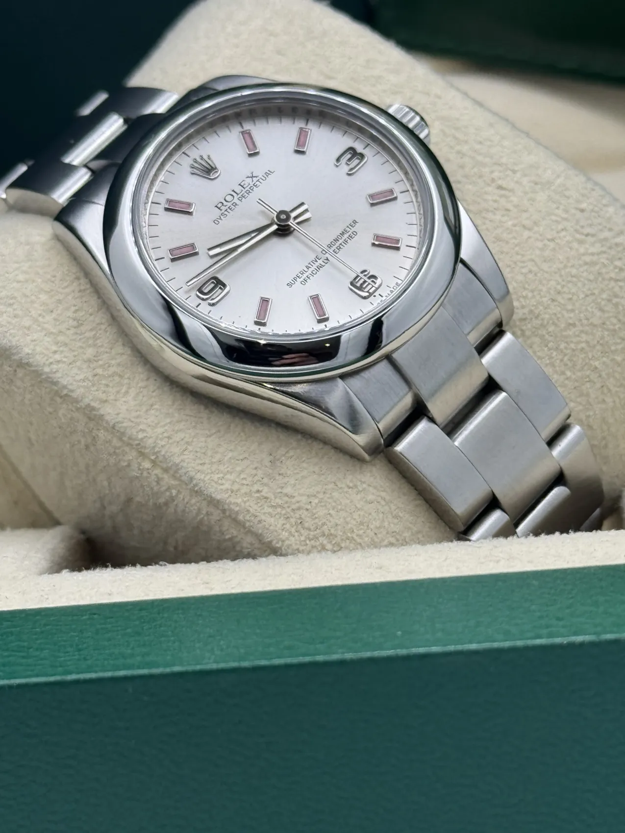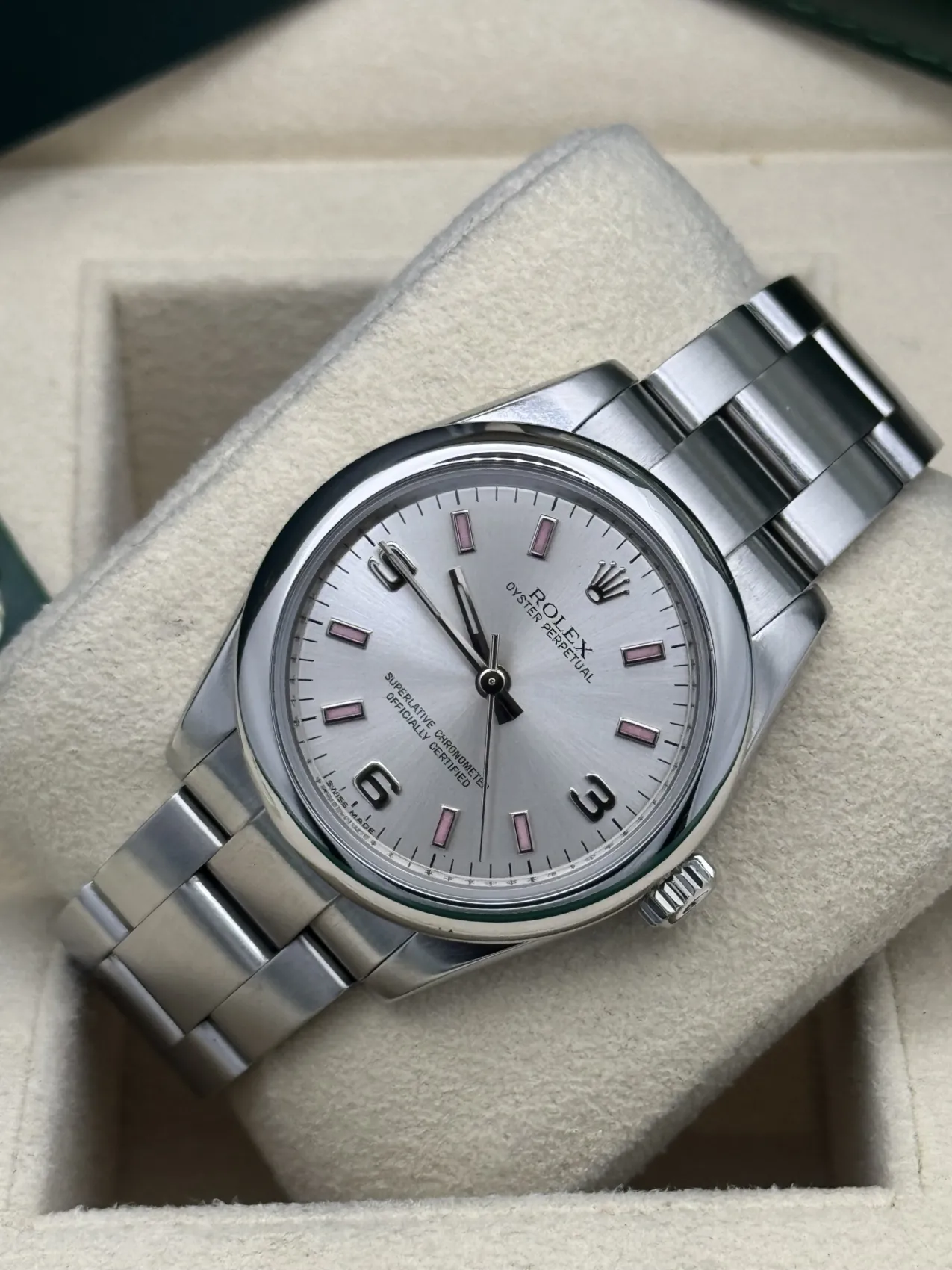 This Rolex Oyster Perpetual 31 reference 177200 features a silver dial with pink Arabic numeral markers, a smooth stainless steel bezel, and the classic Oyster bracelet. Powered by Rolex’s automatic movement and presented in excellent condition, this 2013 model offers a stylish and versatile option within the timeless Oyster Perpetual collection.