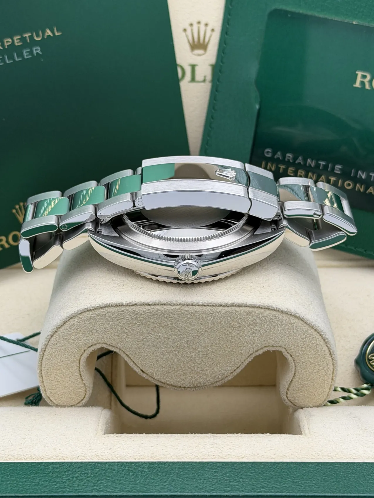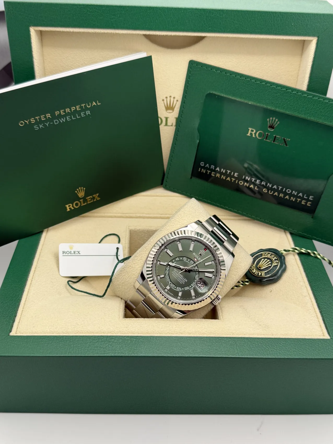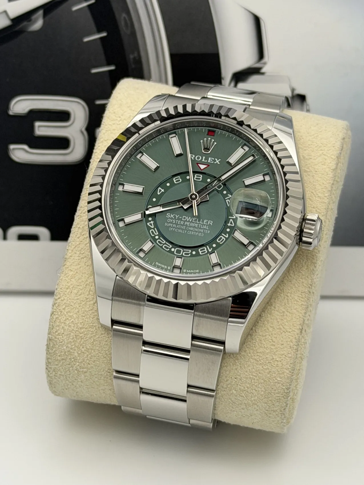 This Rolex Sky-Dweller 336934 features a 42mm stainless steel case paired with a white gold fluted bezel, the highly desirable mint green dial, and the robust stainless steel Oyster bracelet. Powered by Rolex’s automatic calibre 9002 movement, this unworn 2025 model offers exceptional precision, a 72-hour power reserve, and Rolex’s sophisticated annual calendar and dual-time functionality, making it one of the most advanced and sought-after modern Rolex watches.