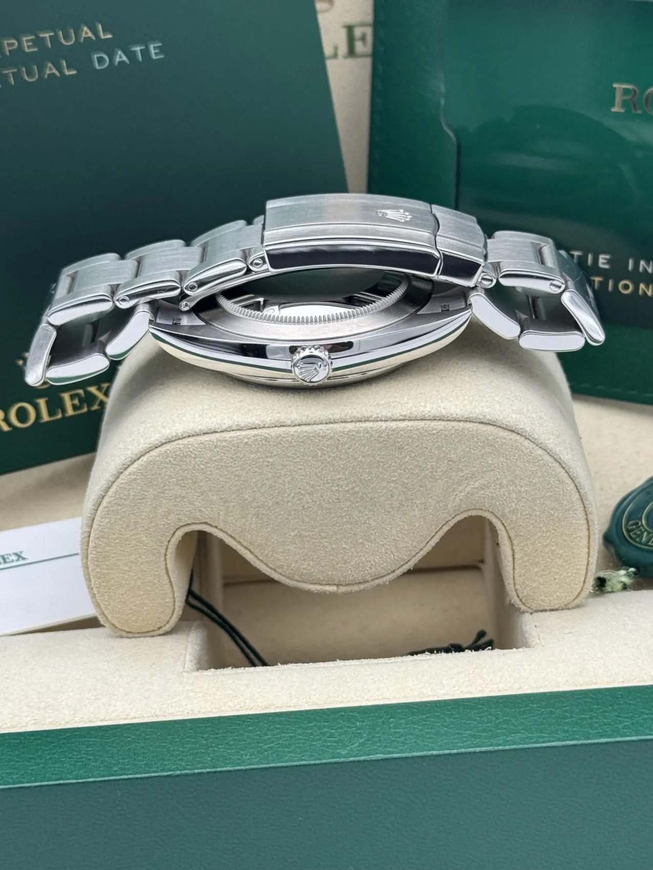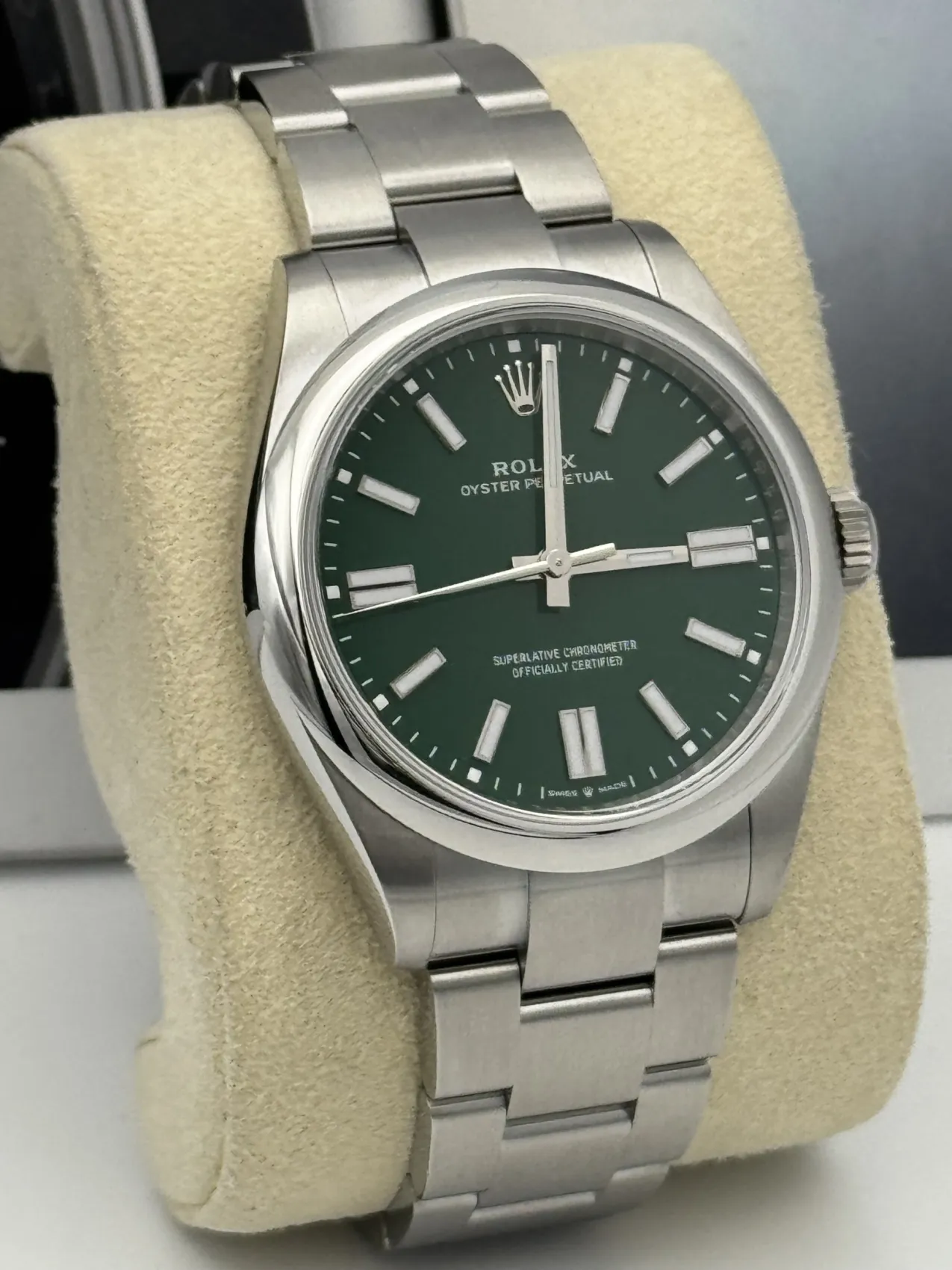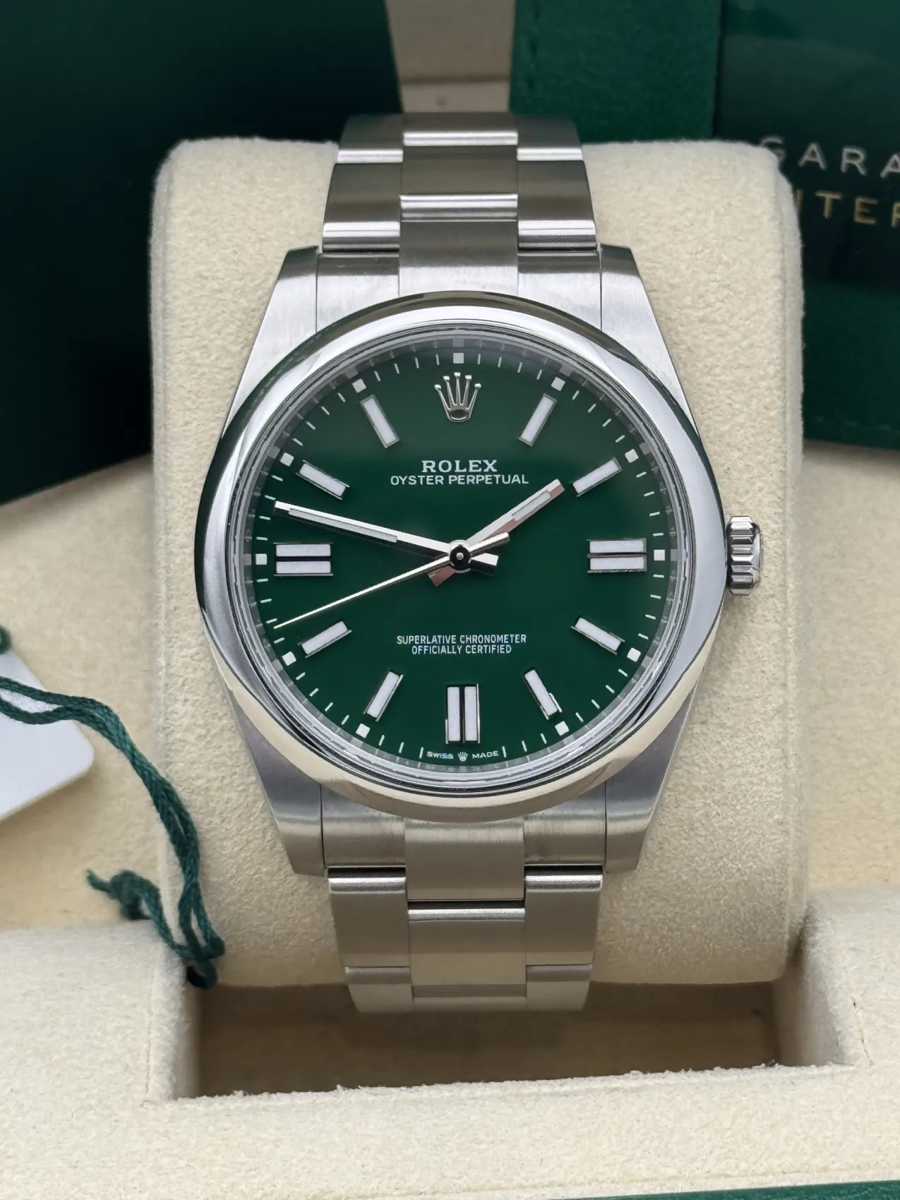 This Rolex Oyster Perpetual 41 features a stainless steel case with a smooth bezel, a striking green dial, and the classic Oyster bracelet, powered by Rolex’s automatic movement, offered in excellent condition.